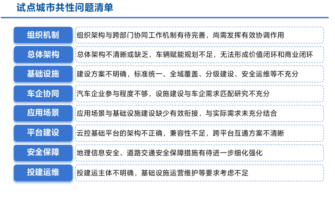 城市在推进车路云一体化建设过程中,认识到当前存在若干难点亟待突破,团队梳理了试点城市共性问题清单,涵盖组织管理、总体技术以及标准规范等多个方面。