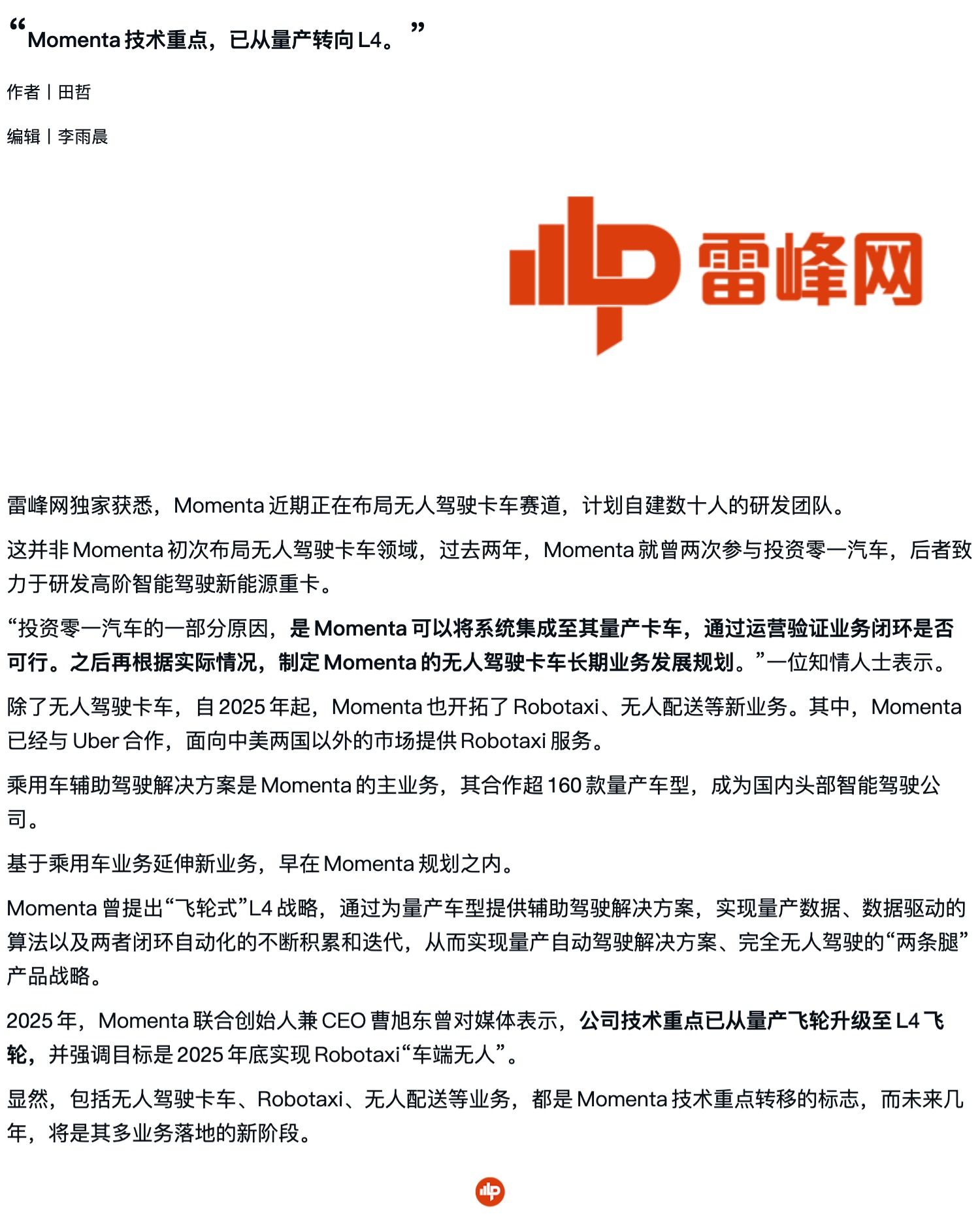 Momenta布局无人驾驶卡车,自建数十人团队