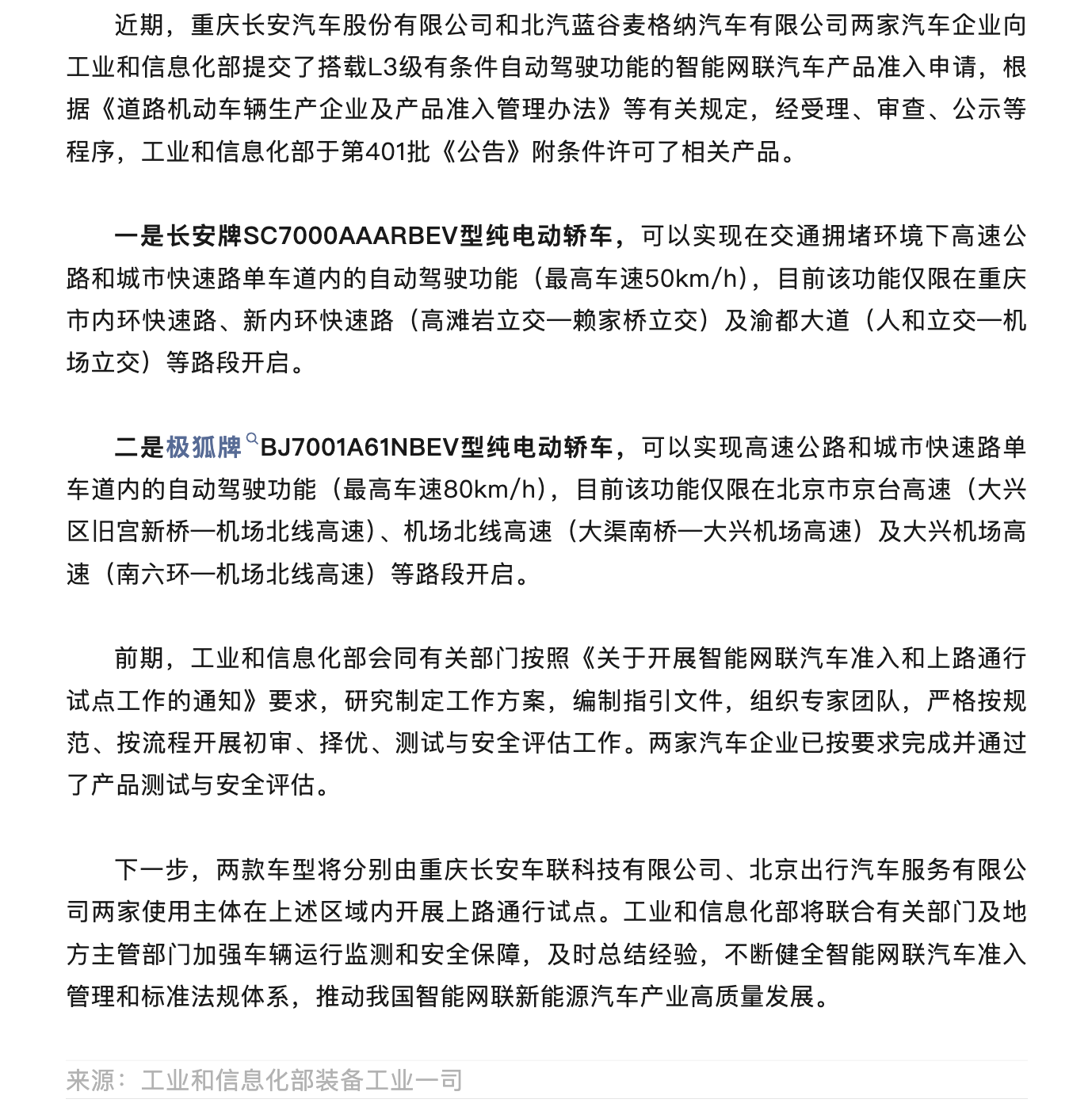 工信部许可两款L3级自动驾驶车型产品