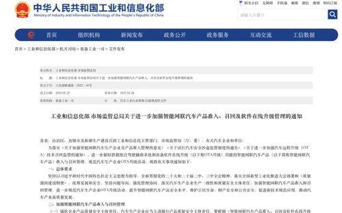 工业和信息化部和市场监管总局联合发布通知,要求进一步加强智能网联汽车产品准入、召回及软件在线升级(OTA升级)管理。通知强调企业需履行产品质量安全主体责任,细化产品准入与召回管理要求,深化产品沙盒监管,健全事件事故报告与研判机制,并加强认证服务和管理。同时,通知还强化了汽车软件在线升级活动的协同管理,要求企业按规定备案并确保升级后的汽车产品符合相关要求。此外,通知还提出了保障措施,包括强化责任落实、加强监督管理和夯实能力建设,以提升智能网联汽车技术和安全水平。