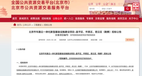 北京市发布车路云一体化新型基础设施建设项目(昌平区、怀柔区、密云区勘察)招标公告。投资额388.297万元(政府投资70%+企业自筹30%),拟对三区394平方公里内约910个路口开展1:500地形图测量及管线探测等勘察工作。