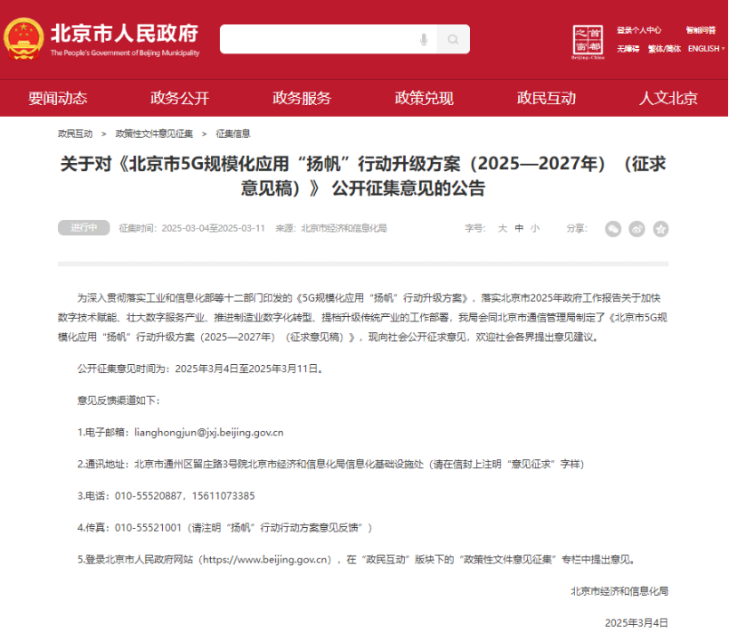 近日,《北京市5G规模化应用“扬帆”行动升级方案(2025-2027年)(征求意见稿)》公开征集意见。《北京市5G规模化应用“扬帆”行动升级方案(2025—2027年)(征求意见稿)》 公开征集意见。