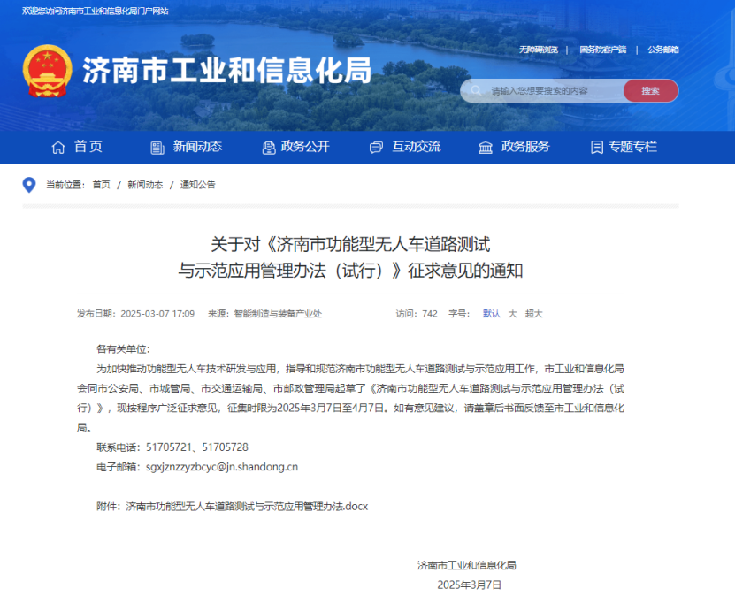 3月12日消息,济南市工业和信息化局会同市公安局、市城管局、市交通运输局、市邮政管理局起草的《济南市功能型无人车道路测试与示范应用管理办法(试行)》正在征求意见。《办法》提出,每辆车投保保额不低于300万元。测试车辆须在车身张贴无人装备标识,悬挂无人车号牌编码;应在非机动车道内顺向行驶,最高车速不超15km/h。