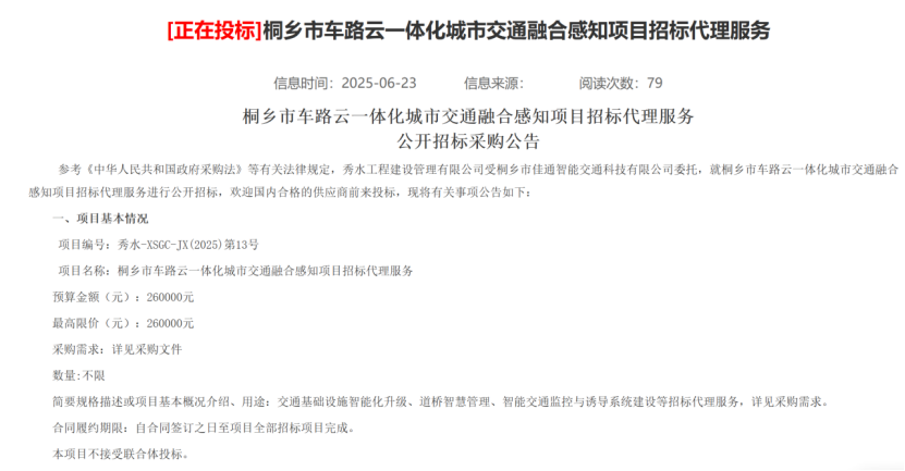 近日,桐乡市佳通智能交通科技有限公司发布招标公告,对就桐乡市车路云一体化城市交通融合感知项目招标代理服务进行公开招标,预计招标代理公司确定后,将陆续开展桐乡市车路云一体化的招标工作。通过本次招标文件中有关项目概况的介绍,项目预计投资约3.96亿元(初步)。